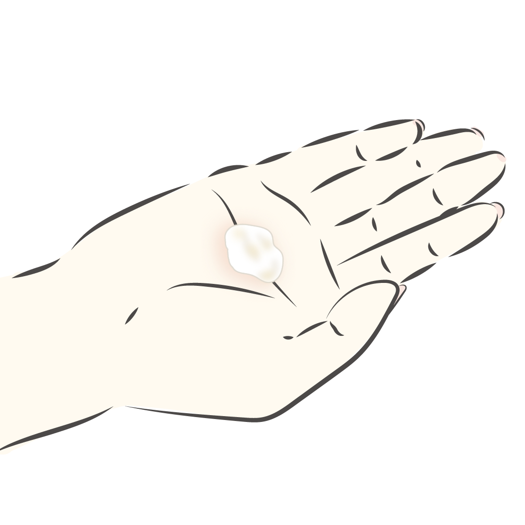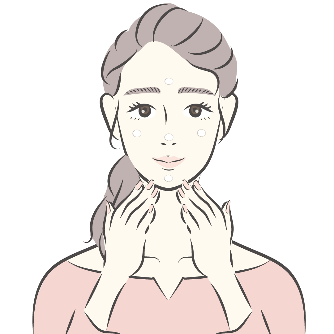 頬などの広い部分からはじめ顔の中心から外側に向かって顔全体に伸ばしながら、もたつきが気になるフェイスラインなどは下から上へ持ち上げるように優しくていねいに なじませます。