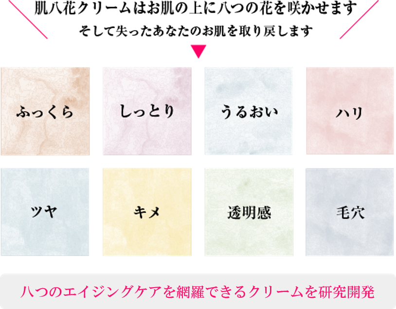 肌八花は年齢肌のふっくら・しっとり・うるおい・ハリ・ツヤ・キメ・透明感・毛穴の対策をすることによって自分の衰えた肌を取り戻すことを目的としています。
