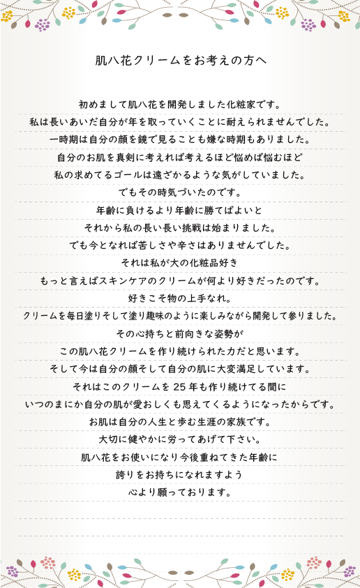 肌八花の研究は一人の化粧家(化粧品製造プロデューサー)の切実な願いから始まりました。