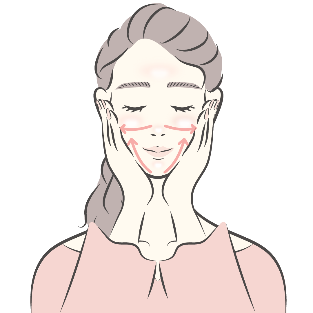 頬などの広い部分からはじめ顔の中心から外側に向かって顔全体に伸ばしながら、もたつきが気になるフェイスラインなどは下から上へ持ち上げるように優しくていねいに なじませます。